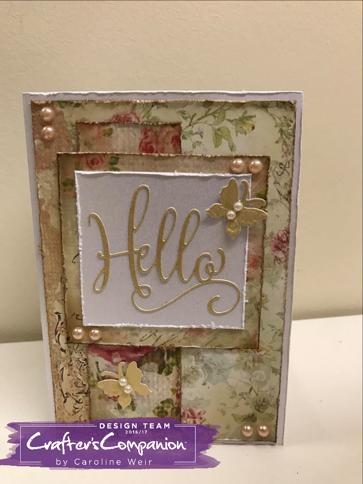 For my card I have used Centura Pearl Fresh White card along with the gorgeous Shabby Chic A3 card. I distressed the edges of the card with scissors and Gathered Twigs Dostress Ink. I used the Hello die from the Sara Signature collection in Centura Pearl Precious Metals card. I die cut some Die'sire Butterflies in the gold card and added pearls.